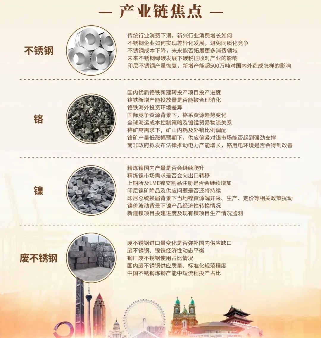 As the global economic growth slows down in 2024, the supply and demand of stainless steel and raw materials are at the brink of collision, full of challenges and opportunities. With the continuous expansion and release of downstream capacity, the demand for raw material imports is increasing. Tianjin Port, as a major transportation hub for ore and iron, radiates the production capacity of the transportation goods to more than 70% of the country's total. Therefore, Mysteel has built a communication and cooperation platform for upstream, midstream, and downstream enterprises in Tianjin, and specially invites more than 500 decision-makers from the global industrial chain to participate in this event, including government chambers of commerce, chromium-nickel mines, chromium-nickel smelters, stainless steel factories, traders, logistics companies, and investment research institutions, to deeply discuss the differences in domestic and overseas investment environments and to help the entire industry chain develop steadily.